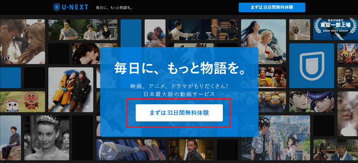 まずは「U-NEXT」公式HPにアクセスし、「まずは31日間無料体験」をクリックします。