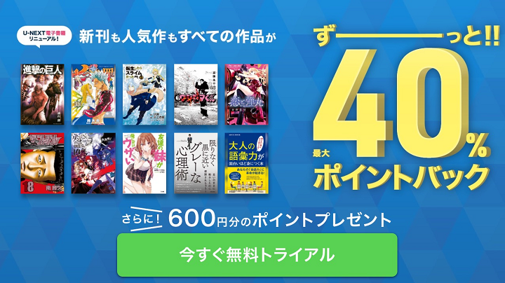動画配信サービスである「U-NEXT」はドラマや映画、アニメが見放題なことで有名ですが、電子書籍も大量配信しています。