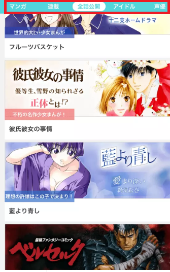 アプリを起動すると上のような画面になるので、赤線で囲った「マンガ」や「連載」などの項目をスライドさせてお好きな項目をタップしてください。