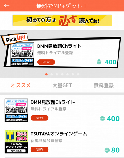 「MP+」はアプリ内で紹介している無料アプリや有料アプリをDLしたり、それに伴う会員登録などをした場合に貰えるポイントです。これは同系統の漫画アプリに限らず、他のアプリやポイントサイトなどでも見るシステムです。